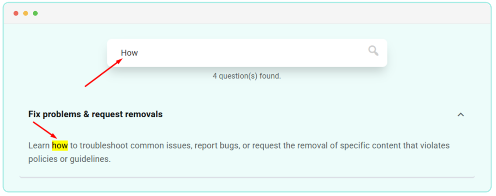 Automatically highlights the searched keyword inside accordion content, helping users quickly find relevant information.
